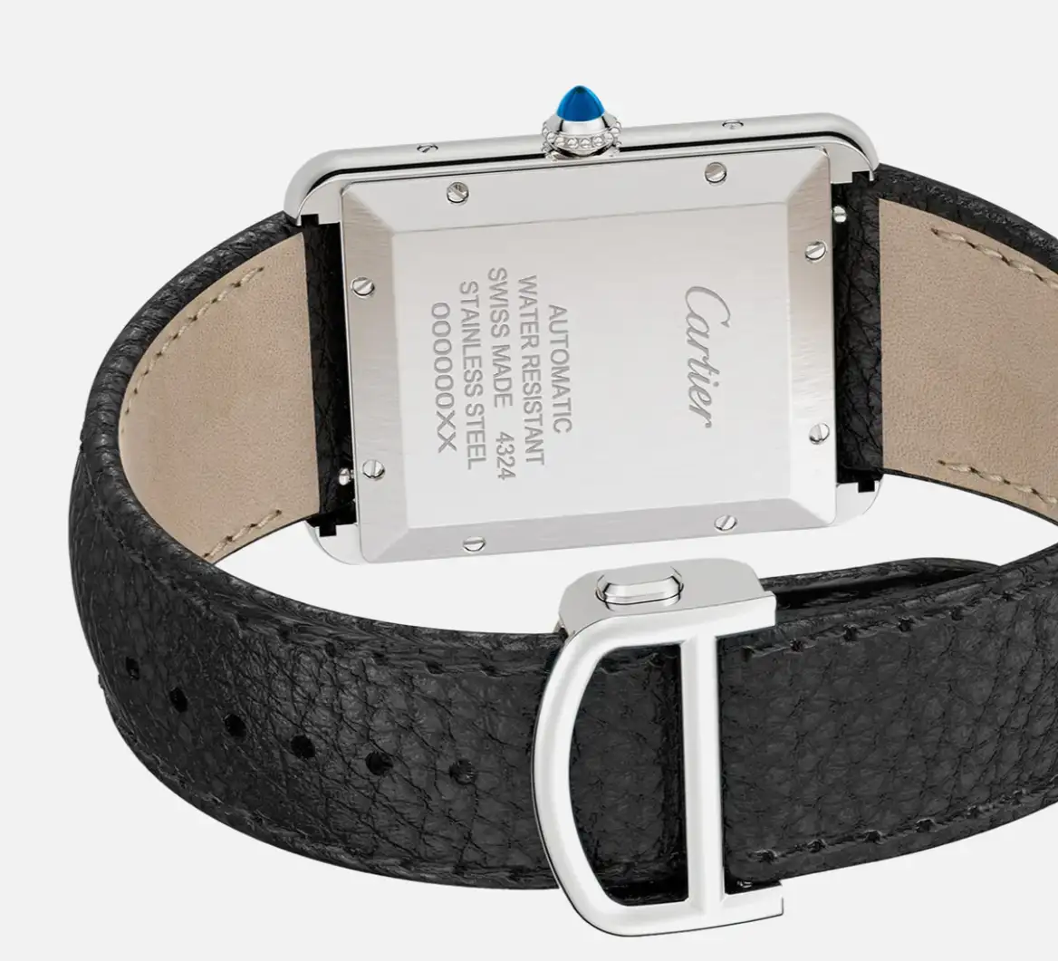 - Silvered Opaline Dial: Has black Roman numerals, blued – steel hands, a date window at 6 o’clock, and the Cartier logo.