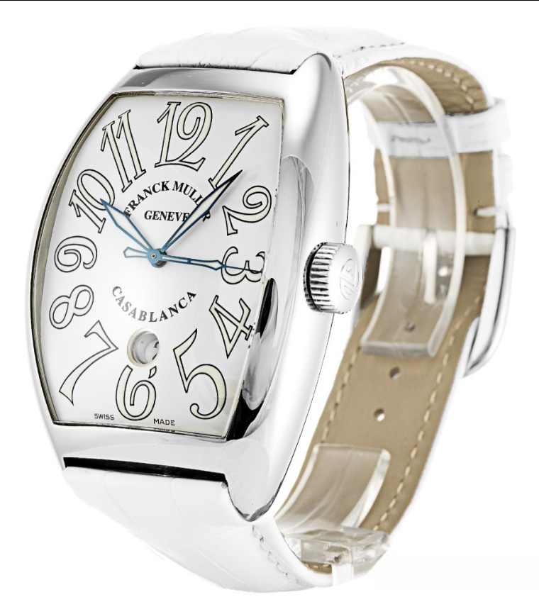The Franck Muller Casablanca 8880 C DT Men Automatic 39 MM watch features a 39mm stainless steel tonneau case, a white dial with iconic numerals, and a white alligator leather strap. With scratch – resistant sapphire crystal, it blends unique design and timeless elegance for discerning men.