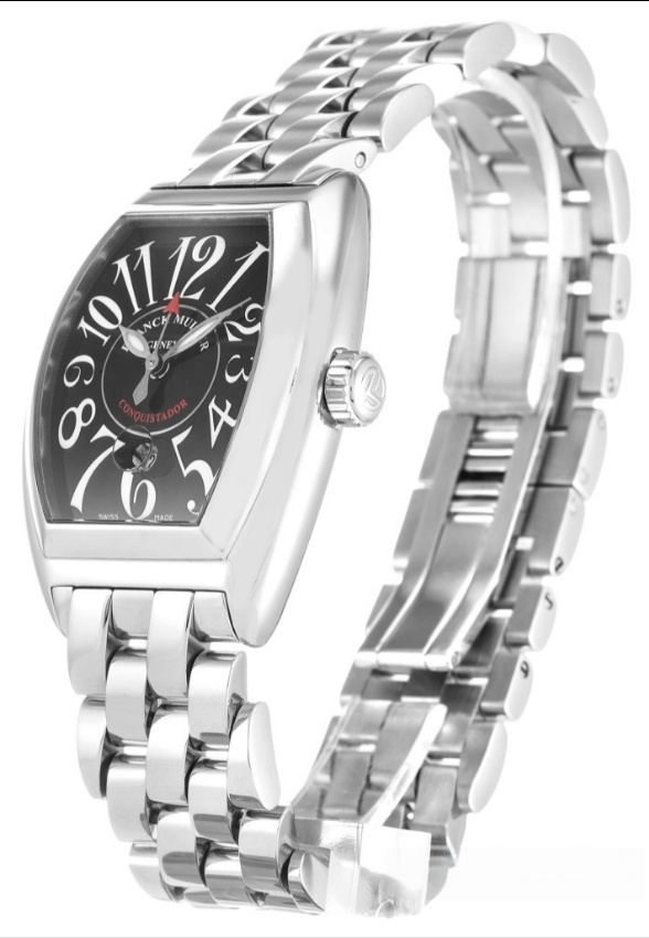 The Franck Muller Conquistador 8005 L SC Women Automatic 27 MM watch features a 27mm stainless steel tonneau case, a black dial with red accents, and a stainless steel bracelet. With scratch – resistant sapphire crystal and 30m water resistance, it blends unique design and elegance for women.