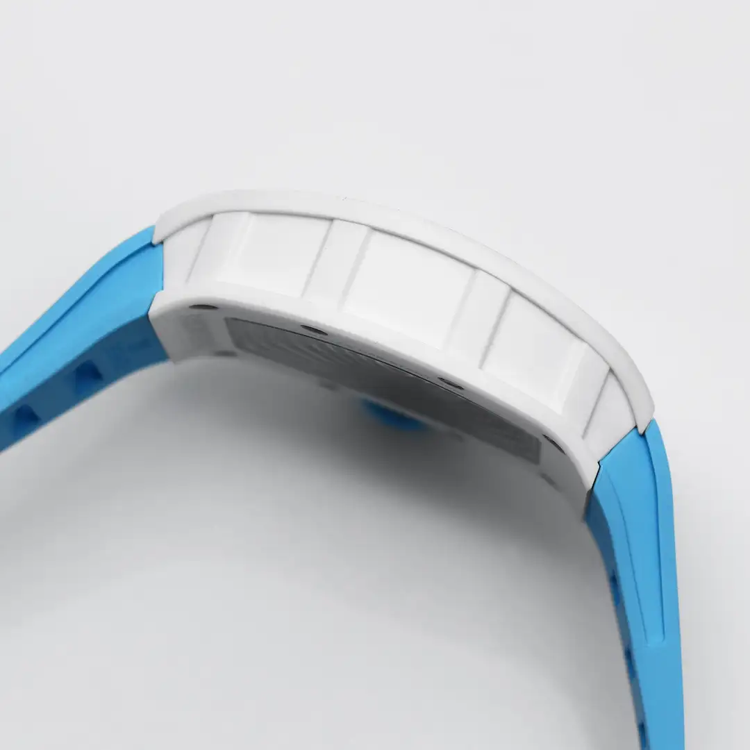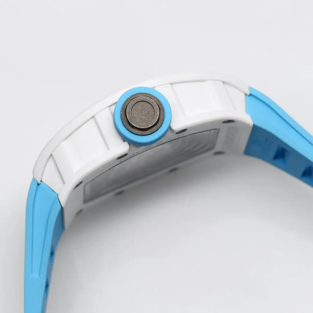 - Design Copycat Moves: This watch rips off the iconic tonneau – shaped case and full – skeleton dial of high – end Richard Mille models. As a Replica, it tries to mimic that sleek, high – tech vibe, but as a Fake, the white and blue plastic – like materials feel cheap—no match for the premium composites in real luxury watches.