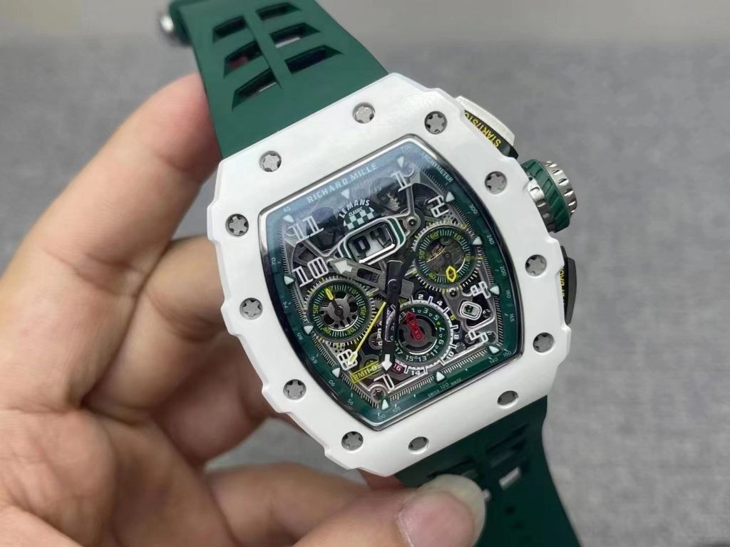 This RM 011 – 03 Yashil Replica features a 50mm case with white and green details and a scratch – resistant sapphire crystal. Its skeleton dial, green rubber strap, and chronograph function combine style and practicality for watch enthusiasts.