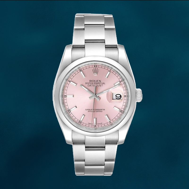 - Dial: Features a pink dial with clear, luminescent hour markers and Roman numerals. The dial design maintains the iconic Datejust aesthetic, ensuring excellent legibility. The date window at 3 o’clock adds practical functionality, while the pink hue brings a touch of refined charm.