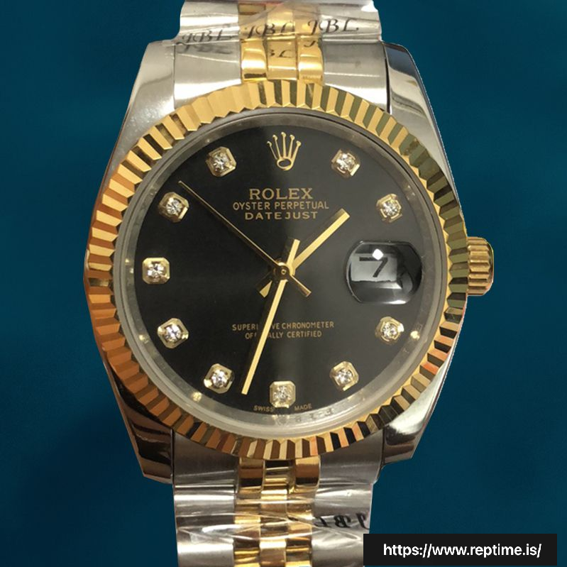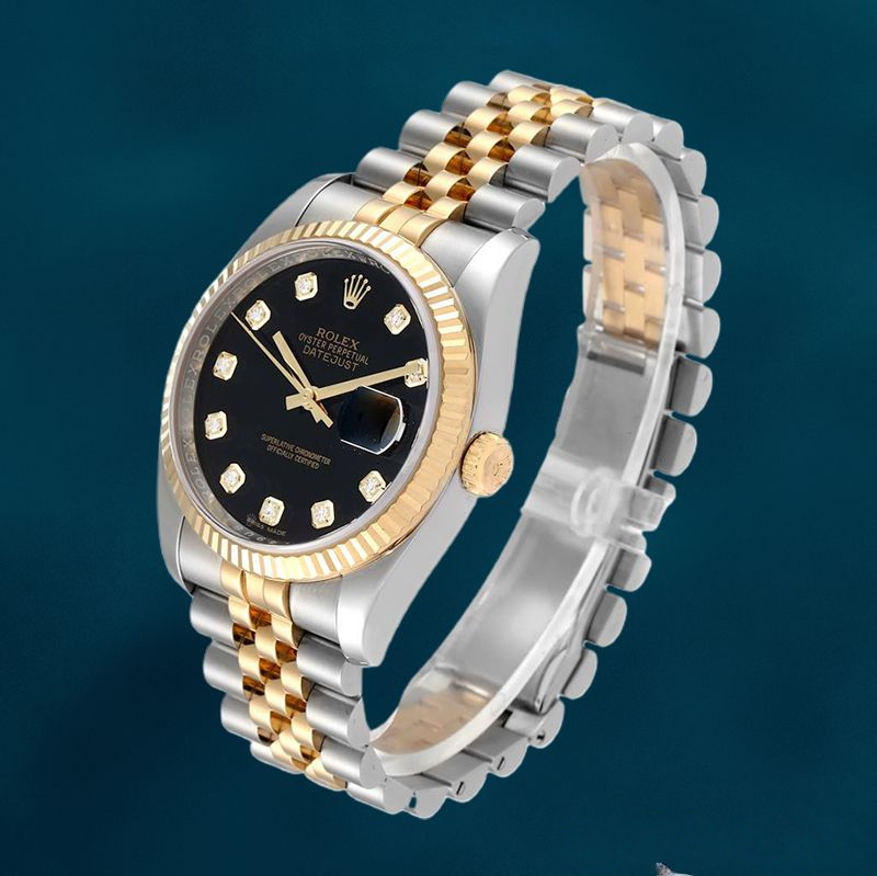 • Dial: Boasts a black dial adorned with sparkling diamond hour markers. The dial design upholds the iconic Datejust look while introducing a luxurious edge. The date window at 3 o’clock adds practical functionality, and the diamond accents contrast beautifully against the black backdrop for a striking appearance.