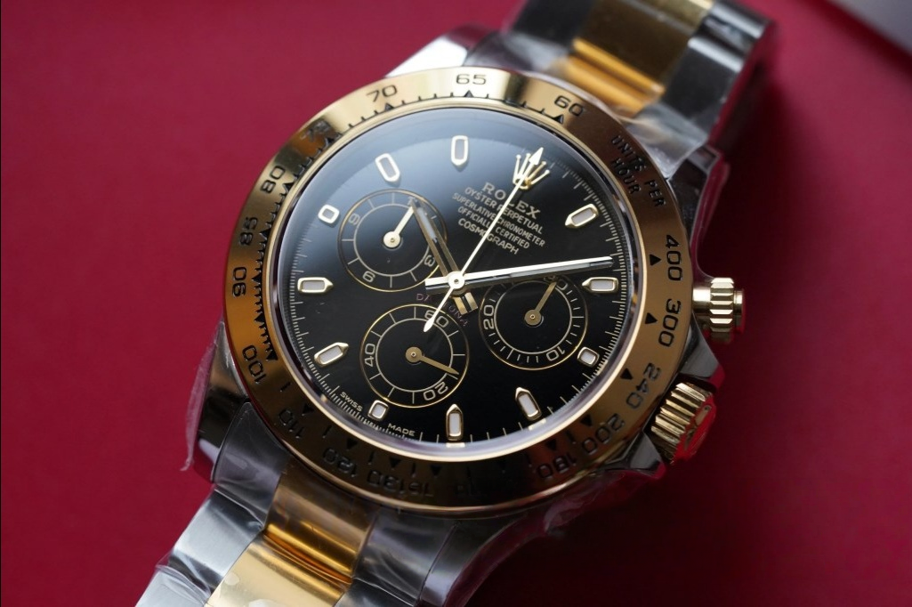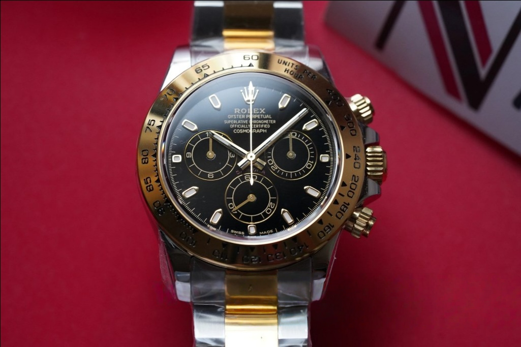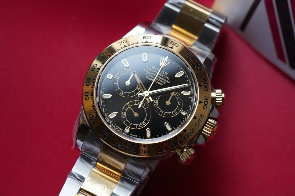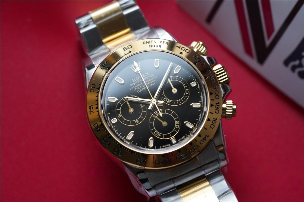 Two-tone Rolex Daytona (black dial, gold accents, Cerachrom bezel). Merges chrono performance (tachymeter, luminous hands) with luxury (two-tone metal, diamond markers). Perfect for collectors – sleek, precise, versatile. Embodying Rolex’s legacy, ideal for any occasion (sporty to elegant), a timeless blend of style and durability.