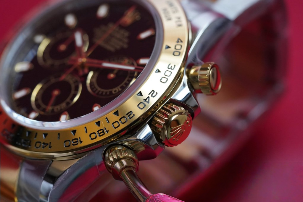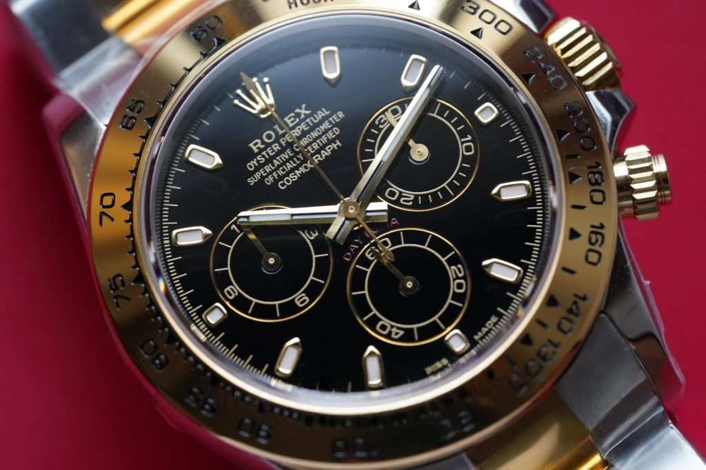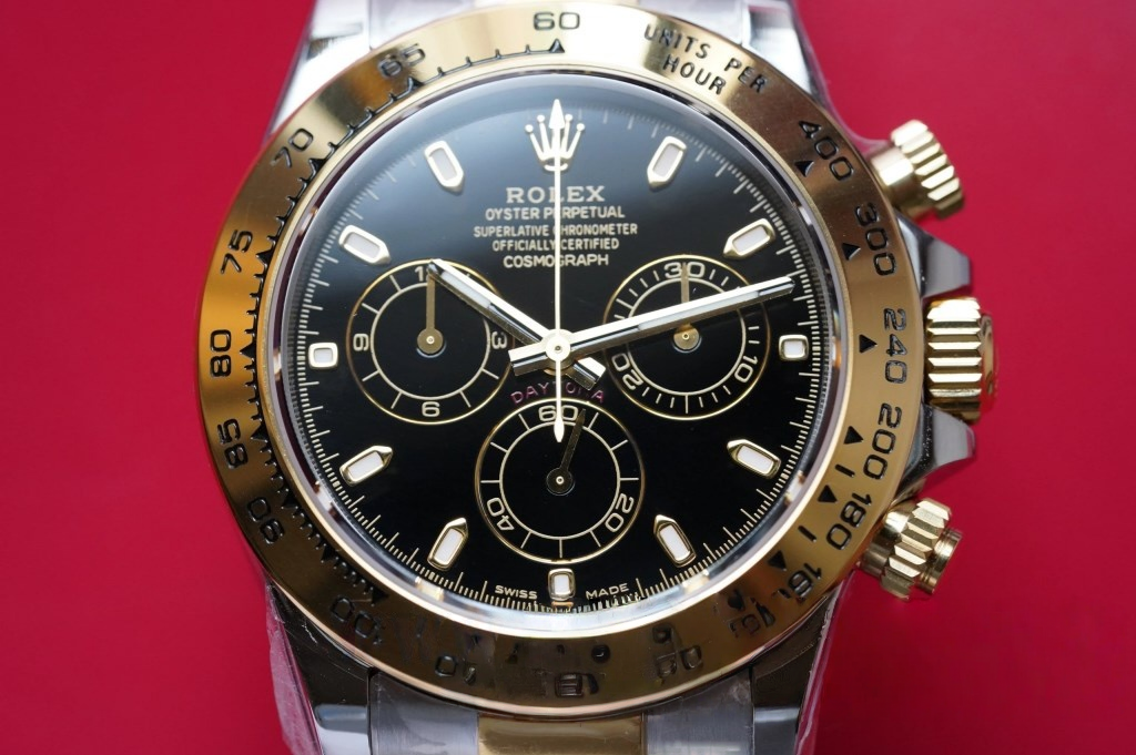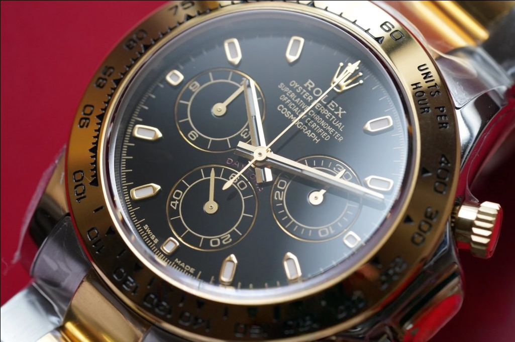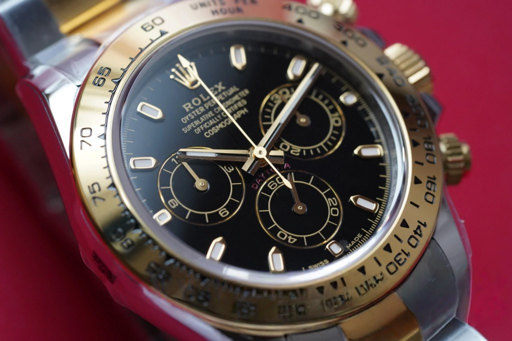 Two-tone Rolex Daytona (black dial, gold accents, Cerachrom bezel). Merges chrono performance (tachymeter, luminous hands) with luxury (two-tone metal, diamond markers). Perfect for collectors – sleek, precise, versatile. Embodying Rolex’s legacy, ideal for any occasion (sporty to elegant), a timeless blend of style and durability.