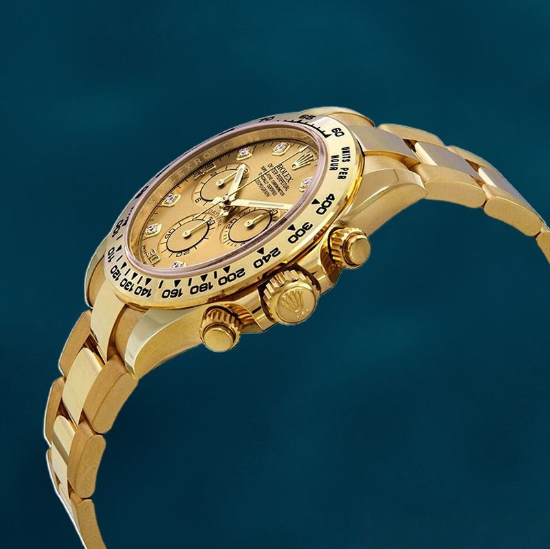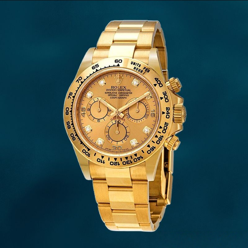 18K gold Rolex Daytona with champagne diamond dial, gold accents, and Cerachrom bezel. Merges chrono performance (tachymeter, luminous hands) with luxury (gold build, diamonds). Ideal for collectors, elegant for any occasion, embodying Rolex’s precision and style legacy.