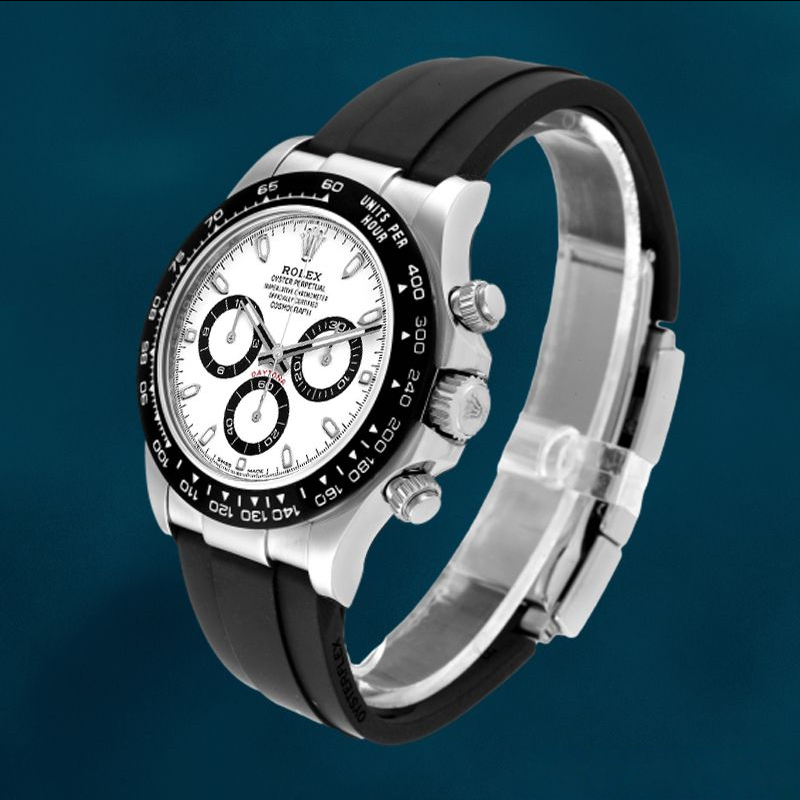 Stainless steel Rolex Cosmograph Daytona with a white dial, black sub-dials, black Oysterflex strap, and black Cerachrom bezel. This timepiece merges high-performance chronograph functionality (tachymeter, luminous hands) with a sleek, sporty design. The stainless steel case and black rubber strap offer durability and comfort, while the white dial with black accents delivers crisp readability. Ideal for both racing-inspired precision and everyday elegance, it embodies Rolex’s legacy of technical excellence and timeless style. Perfect for collectors and enthusiasts, this Daytona balances sportiness and sophistication, making it a versatile choice for any occasion—from high-speed pursuits to formal events.