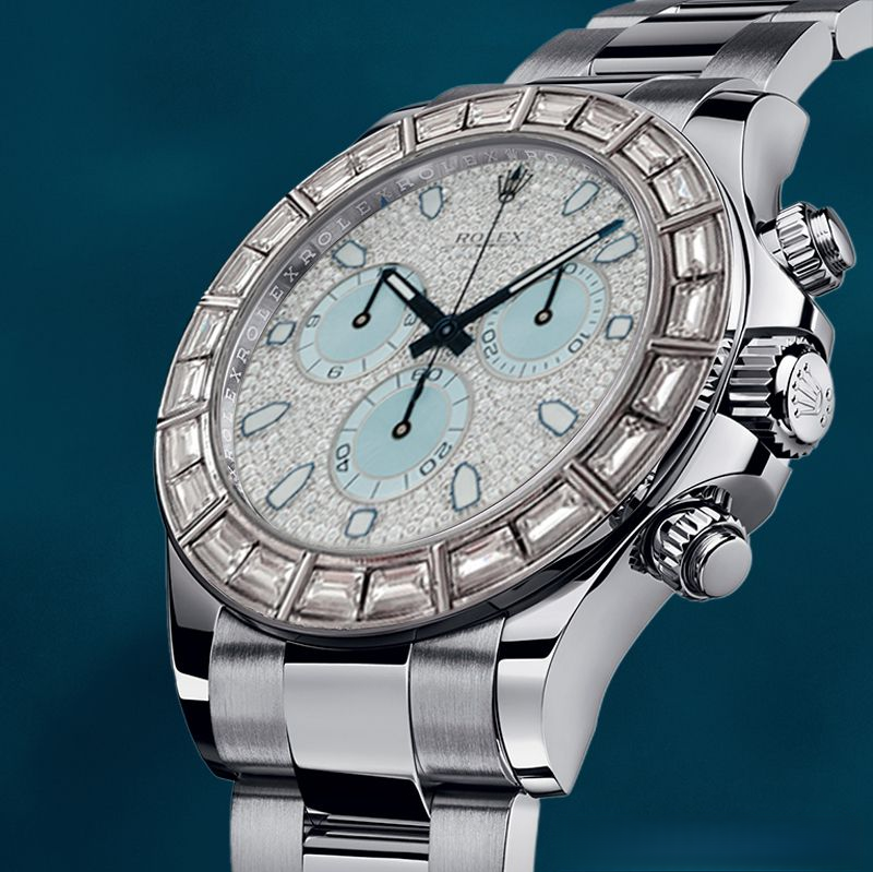 The Rolex Cosmograph Daytona in stainless steel, adorned with a diamond-paved dial, light blue sub-dials, and a baguette diamond bezel, redefines sport-luxury. This masterpiece merges high-performance chronograph functionality (tachymeter, luminous hands) with haute joaillerie artistry—every surface shimmering with diamonds, from the pavé dial to the bezel’s baguette-cut stones. The light blue accents (sub-dials, markers) add a serene contrast, elevating its visual allure. Paired with a stainless steel Oyster bracelet, it balances rugged durability (Oyster case, water-resistant) with unparalleled luxury, making it a statement piece for collectors. Ideal for both high-stakes racing (chronograph precision) and red-carpet events (diamond opulence), this Daytona embodies Rolex’s legacy of fusing technical excellence with artistic craftsmanship. A timeless investment, it transcends trends, symbolizing the ultimate in sport-luxury horology—where diamonds meet performance, and elegance meets precision.
