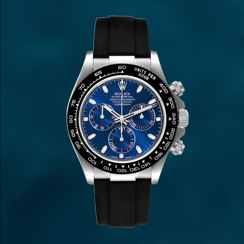 The Rolex Cosmograph Daytona features a 40mm stainless steel case paired with a striking blue dial that has red accents on the chronograph sub – dials. It is complemented by a black Oysterflex rubber strap, offering both comfort and durability. The black Cerachrom bezel with white tachymetric numerals not only adds to its sporty aesthetic but also provides functional speed – measuring capabilities. With its precise chronograph functions and Super – LumiNova – enhanced hands for low – light visibility, this watch is a perfect blend of performance and style. Meticulously crafted with detailed engravings and a convex sapphire crystal, it embodies Rolex’s legacy of precision and luxury, making it an ideal choice for both sports enthusiasts and those with a penchant for elegant timepieces.