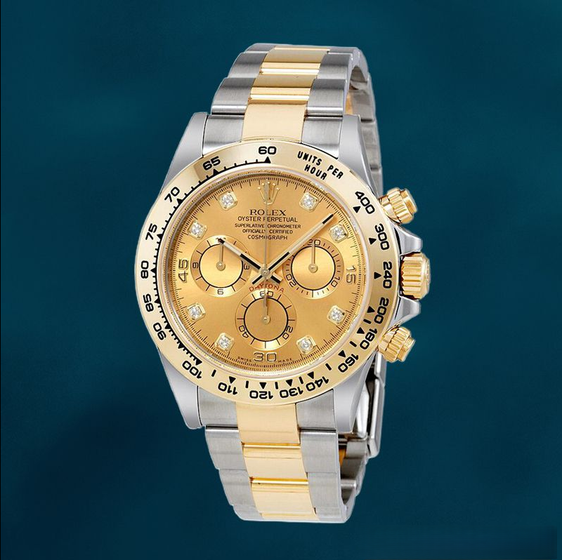 This Rolex Daytona showcases a 40mm two – tone case with a stunning gold dial set with diamond markers. The two – tone Oyster bracelet and gold tachymetric bezel enhance its luxurious sporty appeal. With precise chronograph functions and luminous hands, it marries high – end elegance with practical performance. A timeless piece that embodies Rolex’s heritage of craftsmanship and luxury, perfect for those who desire a blend of opulence and functionality.