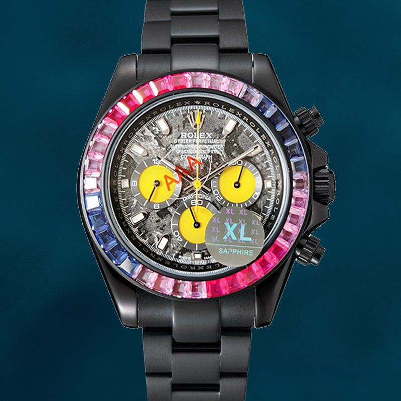 This Rolex Daytona is a rare gem. Its black PVD case, meteorite dial, and rainbow gem bezel create a bold, cosmic – luxury look. The yellow sub – dials and black rubber strap add a sporty edge, while the sapphire crystal ensures durability. With precise chronograph functions, it’s a perfect blend of style and performance, ideal for collectors seeking a unique, high – end timepiece.