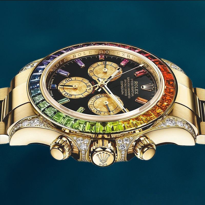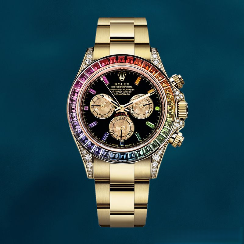 This Rolex Daytona is a pinnacle of luxury. Its 18K gold construction, paired with a rainbow gemstone bezel and black dial with gemstone markers, is a sight to behold. The chronograph functions, including the tachymeter and luminous hands, combine practicality with style. A masterpiece that marries high – end jewelry aesthetics with precision timekeeping, it’s a coveted piece for collectors and luxury enthusiasts.