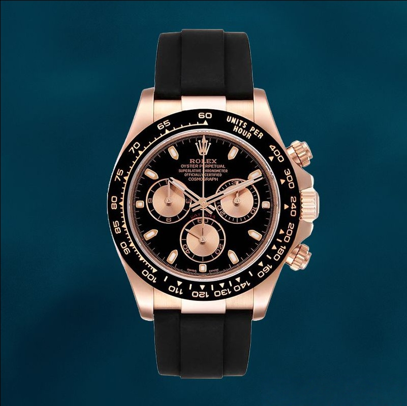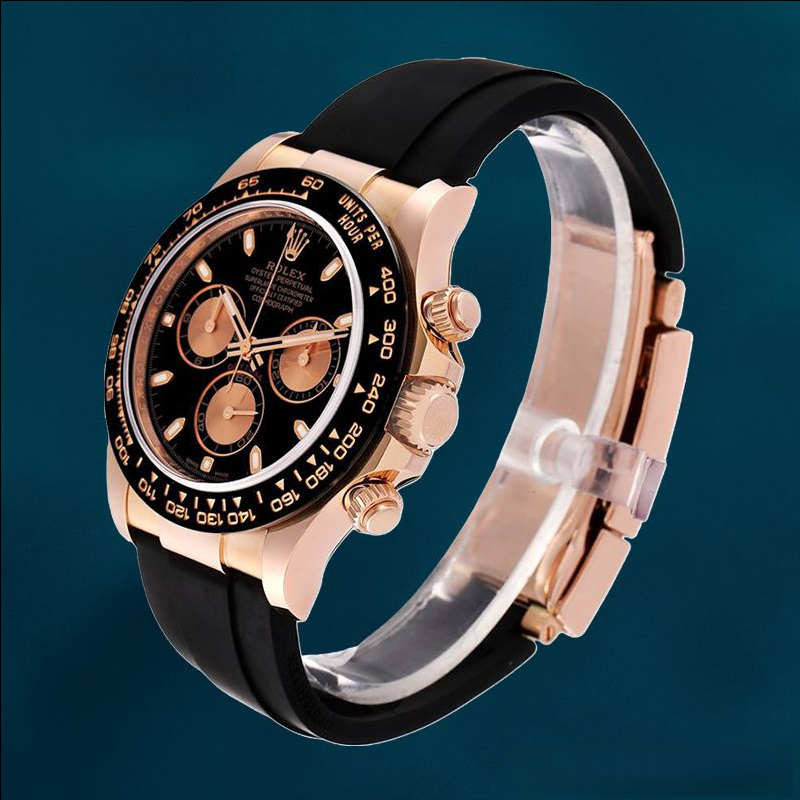 This Rolex Daytona blends luxury and style with its full rose gold case and black enamel dial. The three – piece electroplated dial and authentic – looking bezel showcase meticulous craftsmanship. Paired with a comfortable rubber strap, it’s an ideal choice for watch connoisseurs seeking a blend of elegance and modernity.
