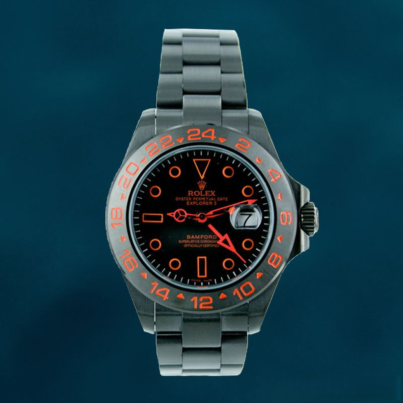 - Dial: A black dial with vibrant orange hour markers and a 24 – hour hand, customized by Bamford. The design combines bold color with the Explorer II’s utilitarian roots.