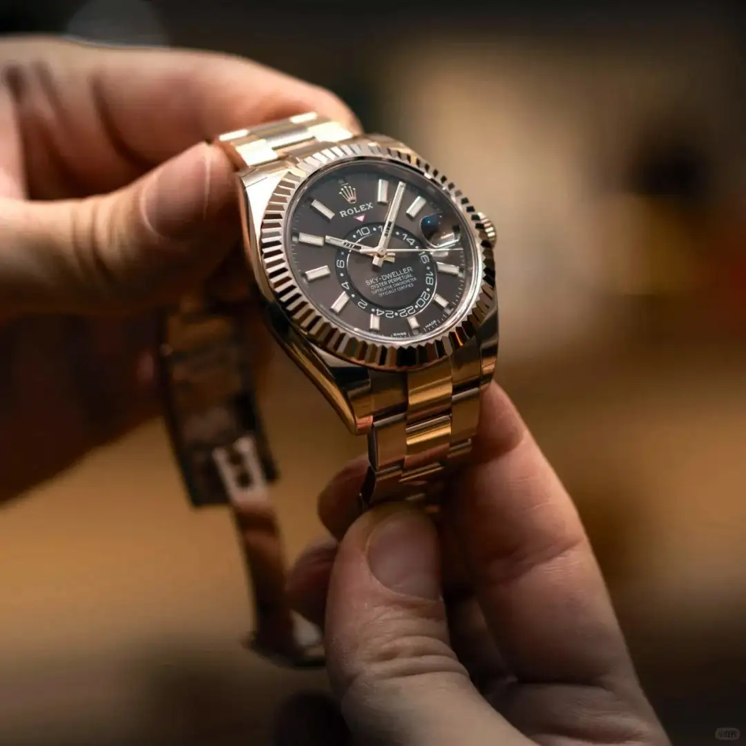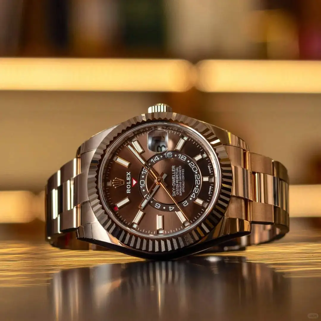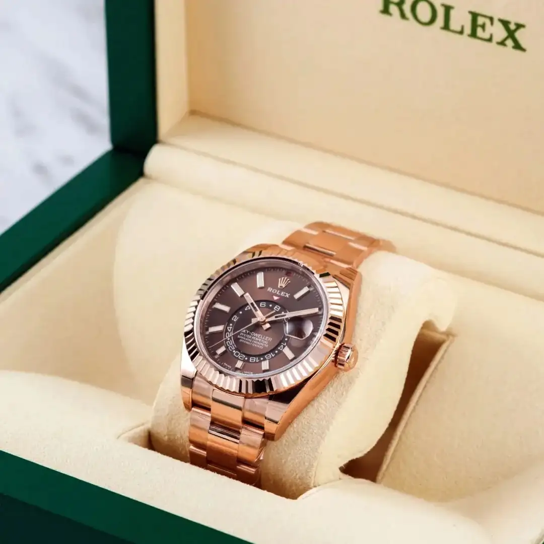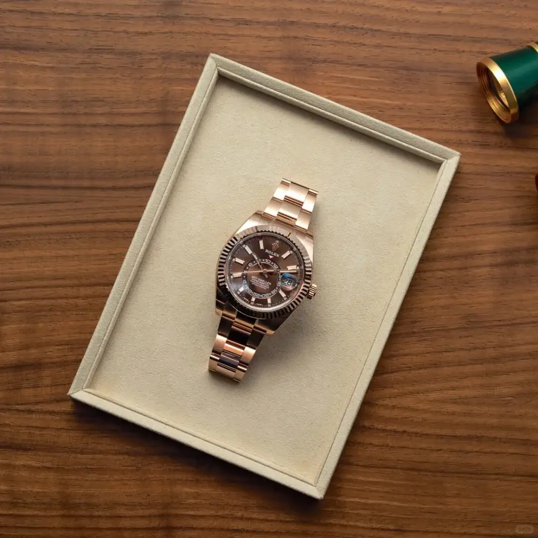 Embrace horological sophistication with the Rolex Sky-Dweller Everose Gold Oyster Bracelet Chocolate Dial. This masterpiece redefines luxury timekeeping: the Caliber 9001 movement delivers chronometer – level precision, while the annual calendar and dual – time display simplify global travel. The 18K Everose gold case exudes warmth, paired with the matching Oyster bracelet and rich chocolate – brown dial. Whether in the boardroom or at evening events, its user – friendly complications (adjustable via the Rotatable Bezel System) and scratch – resistant sapphire crystal ensure seamless performance. A symbol of Rolex’s craftsmanship, this timepiece is a must – have for connoisseurs who demand a fusion of technical excellence, elegant design, and enduring luxury.