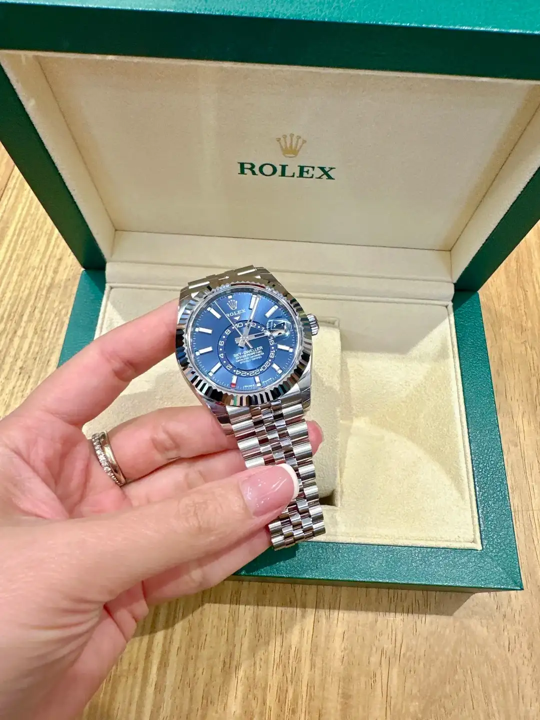 Rolex Sky Dweller Blue Dial White Gold Bezel Steel Jubilee 326934