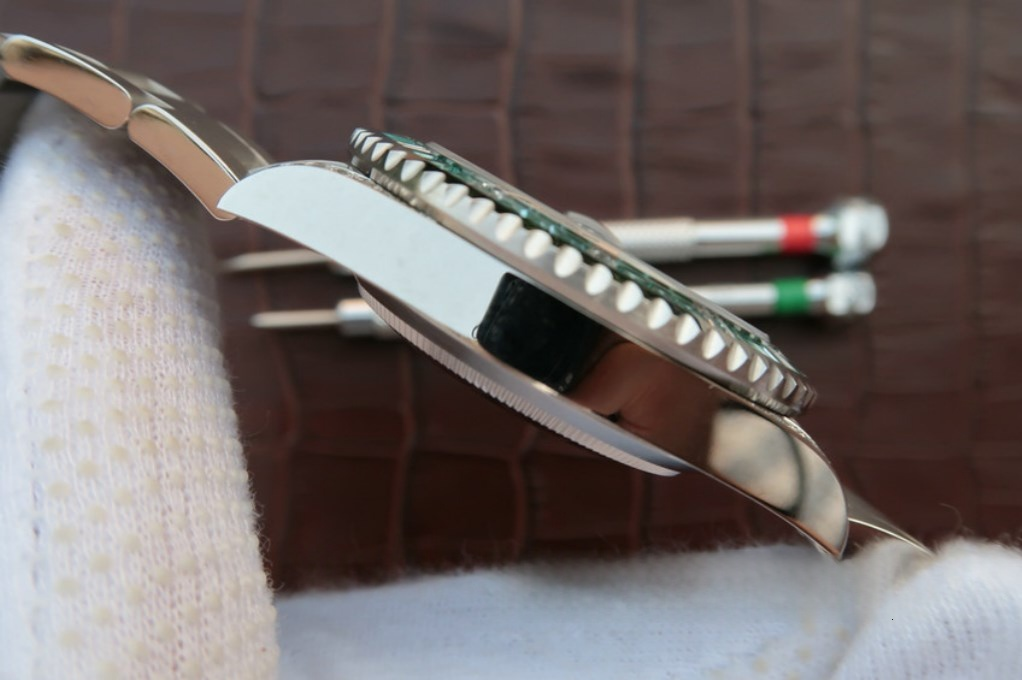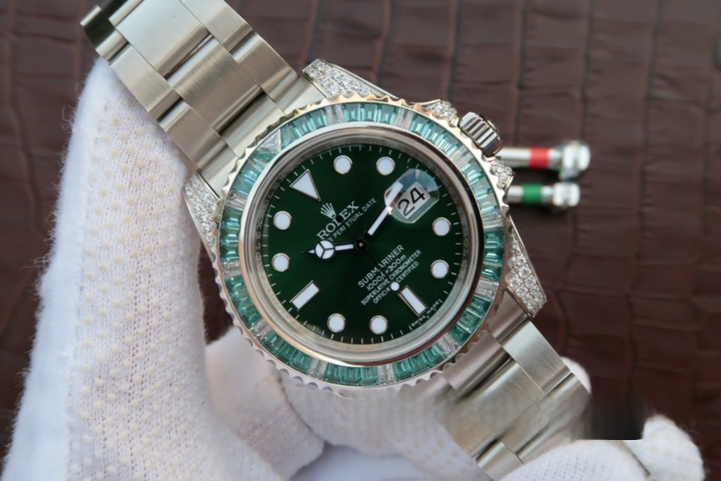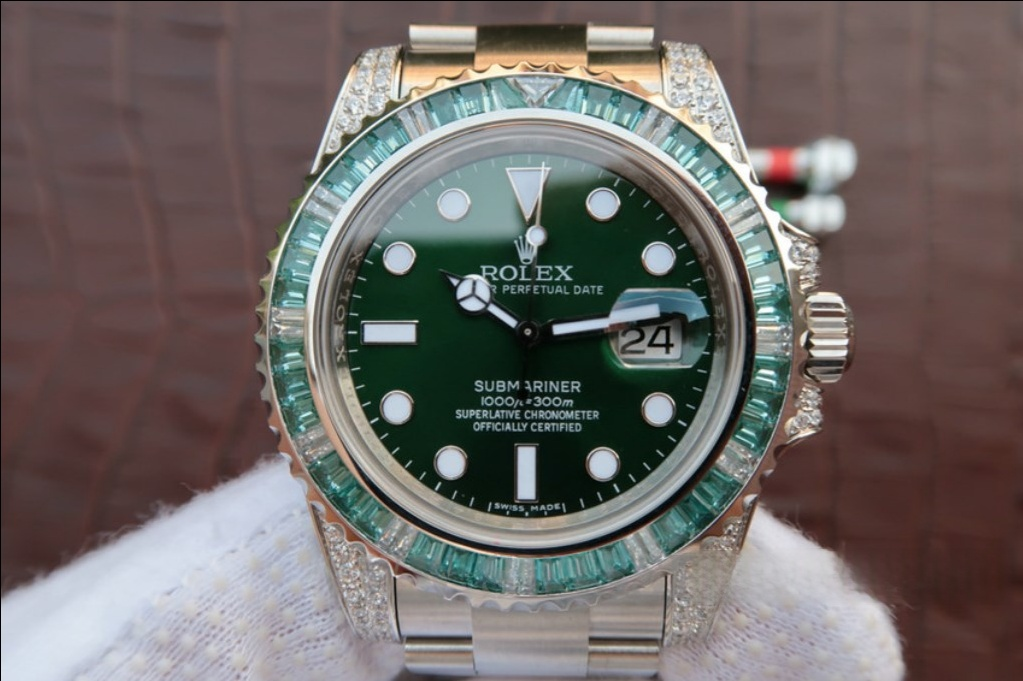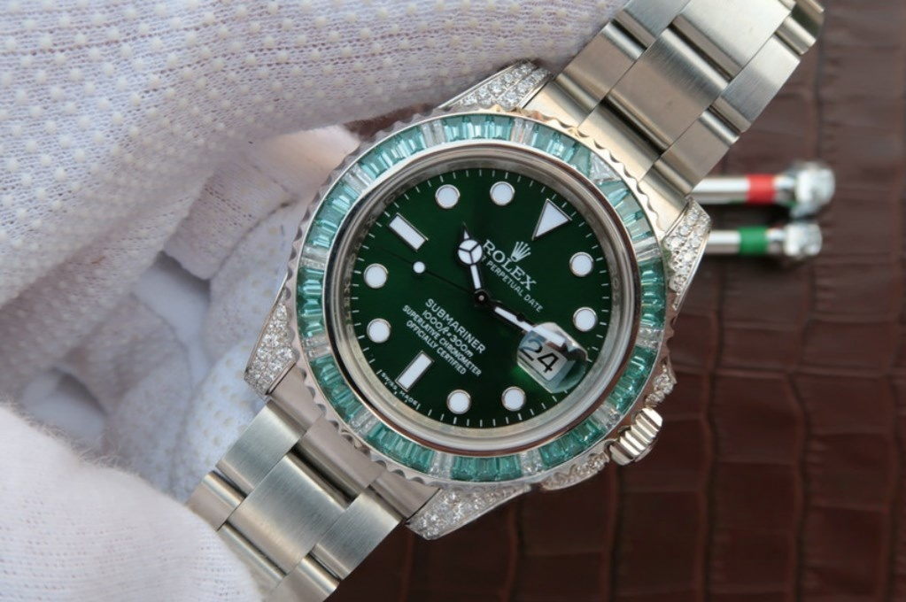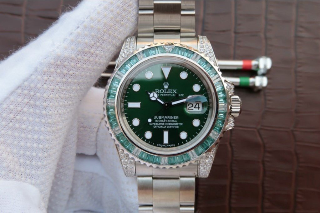 – **Custom Design:** This Rolex Submariner features a unique custom design with green and diamond elements, setting it apart from standard models.