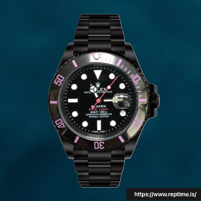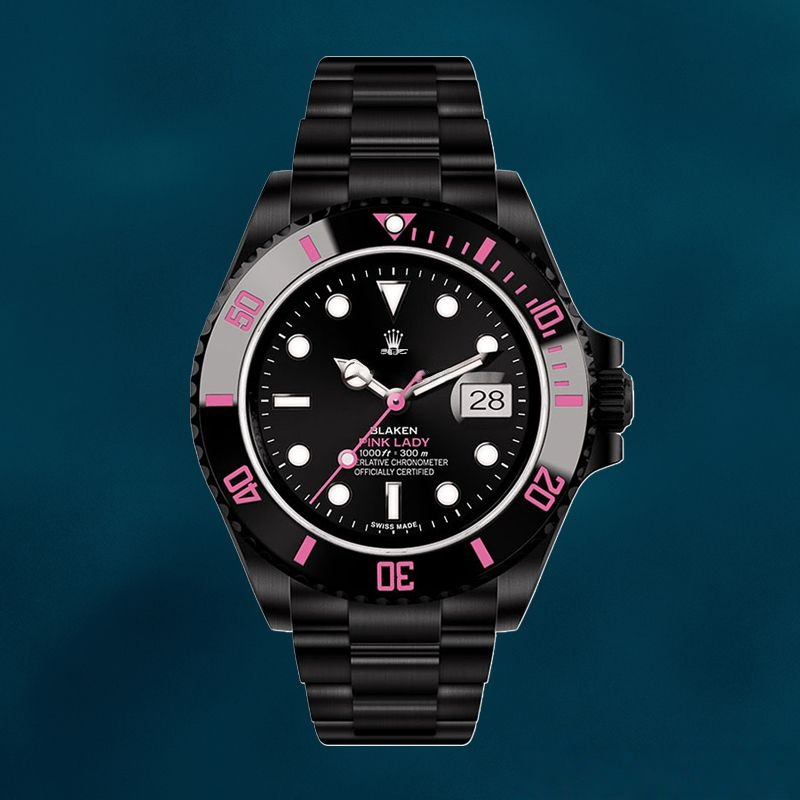 This Rolex Submariner 40mm PINKLADY men’s watch features a black dial with pink accents, luminous markers, and a date display. A stylish and distinctive timepiece.