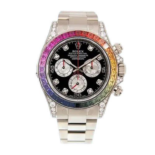 Rolex Daytona Cosmograph Rainbow Crystals Bezel Rose Gold Strap Black Dial 80251